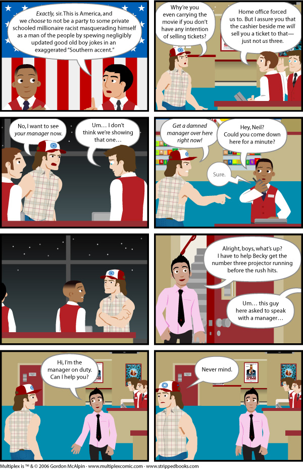 Monday Mar 27, 2006 Mar 26, 2006 0 Facebook Tweet Email Working at a movie theater is exactly like this... except our home office forces to sell the tickets as well.