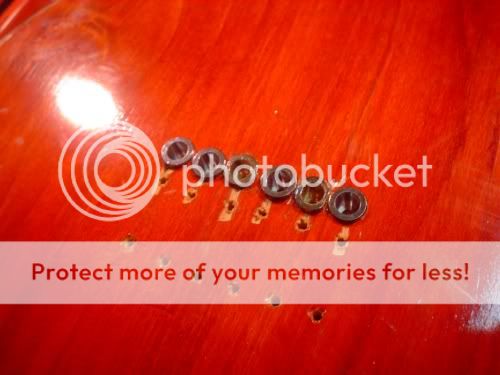 I've tried various necks on this body before settling on this short scale Danelectro neck. With each neck I had to move the bridge forward or back and drill six new holes for the strings to feed through. Normally when you feed strings through the body like that, there are little cups called ferrules that hold the ball ends of the strings in place. Until tonight, the ball ends just stopped at the body and the guitar would go out of tune as the ball ends sank into the wood. I pieced together enough ferrules out of scrap parts to make a full set.