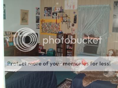 Here's the grand entrance. What can we spy? I spy school shit on my bed. Accounting textbook. Poster in the distance of all the Simpsons characters... Morrissey pictures, heap o'stuffed animals... and that's my cat Keefer sitting on my sister's bed. It's still there even though she's away at college 99% of the time.