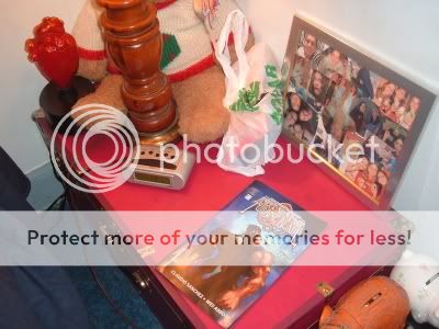 That's crap that remains beside my bed. Alarm clock. Coheed comic book I must've been looking at sometime. Bag o'pictures. Collage my friends and I made last Christmas. Large Christmas teddy bear tucked in the corner. And a heart that you plug in and it has all those little electro-thingies in it that go to your hand when you touch it. Seth got that for me for Christmas last year.
