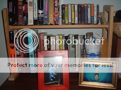 Some books. Some videotapes. Some cassettes. Definitely not all that I own. The picture to the left is Shannon giving me a piggyback ride. The picture to the right is Tegan and I at prom last year. That styrofoam cup is one that I saved from the shithole I used to work in during this past summer. I keep random little notes and pieces of paper in that.