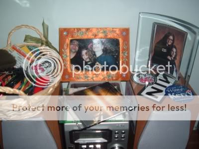 Frankie, my little stereo. At the time I must've been listening to the CD crushjunkie sent me, because it's laying ontop of the CD player. The picture in the middle is of my encounter with Coheed and Cambria's lead singer, Claudio Sanchez. As you can see, I was freakishly happy. I am kind of slapping Jessica in the face with my hair. That's not very nice. The other picture is of Jessica and I. Aww. Aren't we purdy?