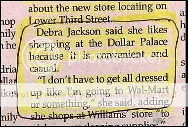 I know exactly what she's say'n. Yesterday I had to get some toothpaste, but I had not picked up my dry-cleaning and my Dockers were a wrinklie mess. Damn Wal-mart and their imposible standards.