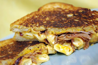 macaroni and cheese with sharp cheddar with bbq pork, caramelized onions